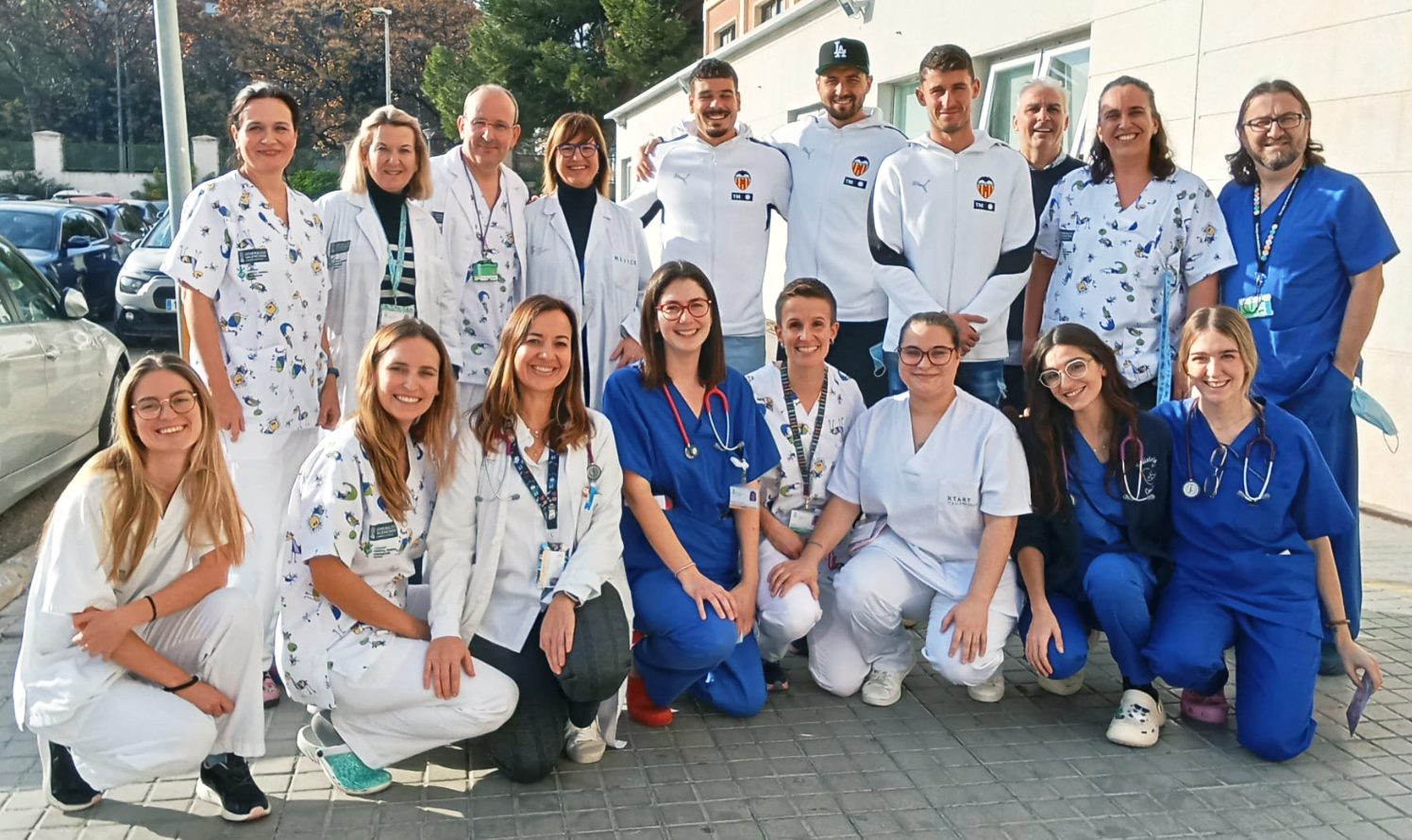 Los jugadores del Valencia CF animan con sonrisas, autógrafos y balones a los pequeños ingresados en el Hospital General