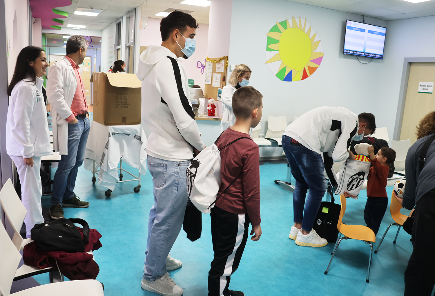 Los jugadores del Valencia CF animan con sonrisas, autógrafos y balones a los pequeños ingresados en el Hospital General