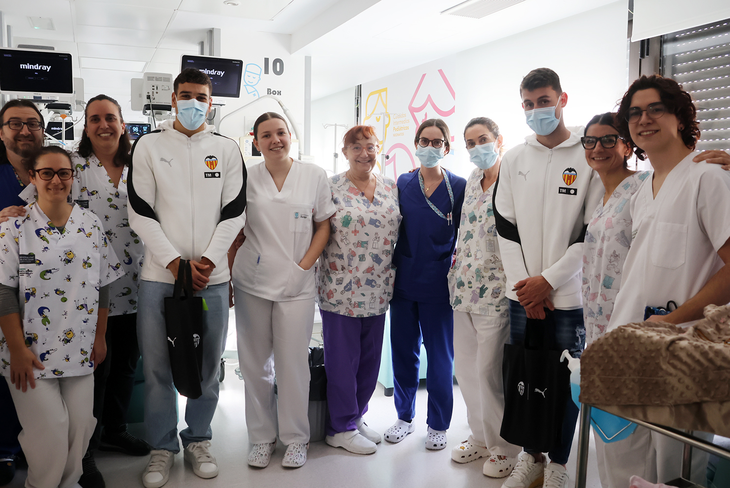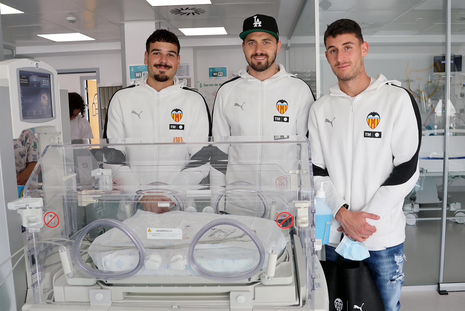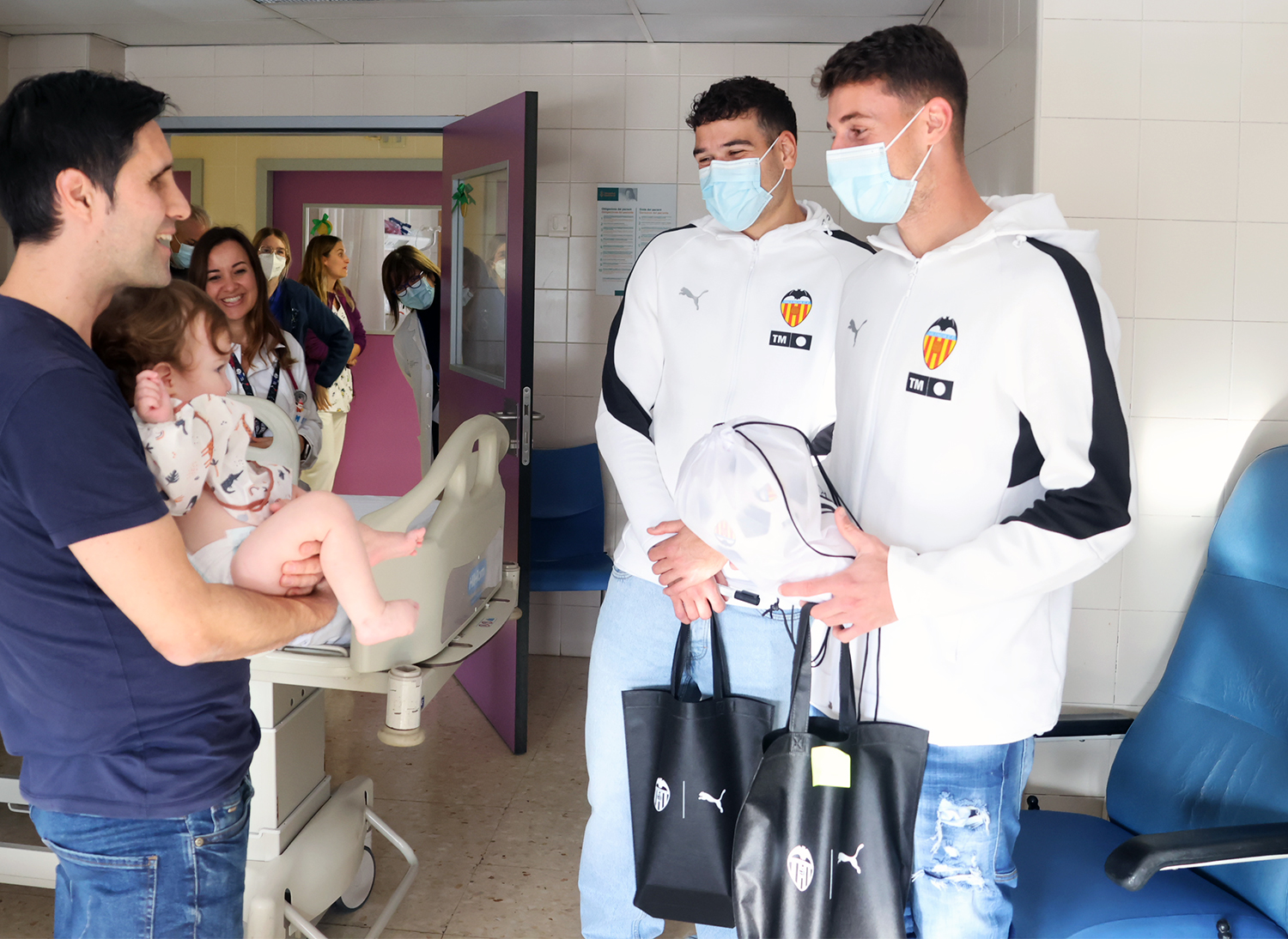 Los jugadores del Valencia CF Dani Raba (delantero, natural de Santander), Stole Dimitrievski (portero, de Macedonia) y Filip Ugrinic (centrocampista, de Suiza), acompañados por el delegado del primer equipo David Rangel, han visitado la planta de Pediatría del Hospital General de Valencia, donde han compartido una mañana de sorpresas, sonrisas y emoción con los menores ingresados.